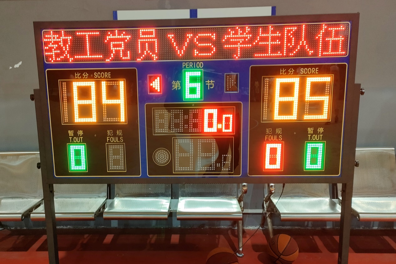 比赛在双方球员入场式和相互握手加油中拉开序幕。教工党支部以三男二女作为首发阵容出场,对阵员工党支部女篮校队,首节比赛后建立下领先优势,接下来教工队派出全员男队阵容与员工党支部男队女队轮番对抗。比赛共6节,持续了3个小时,员工队明显后劲更足,教工队一直紧咬比分,但最终以84:85一分之差惜败。正是青出于蓝而胜于蓝!