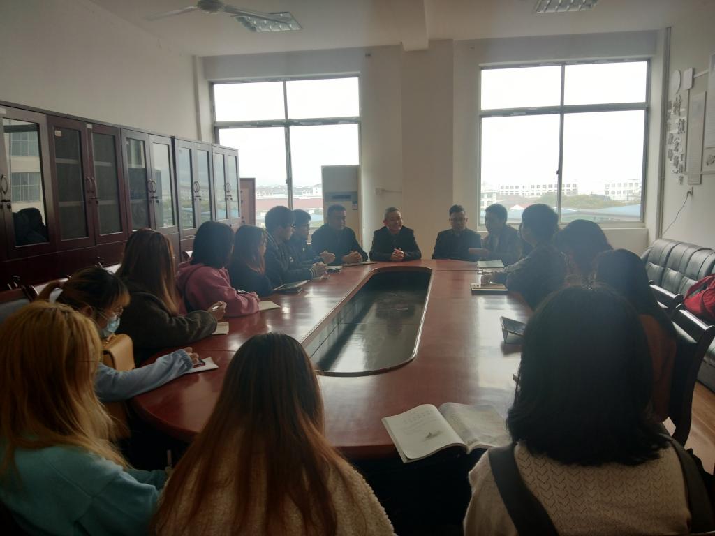 11月13日上午,玉环市教育局副局长薛林峰一行来到教师教育公司与全体玉环定向生进行座谈交流,公司党委副书记吴磊,学工办主任阮溶明参加座谈会,谢飞祥老师主持。