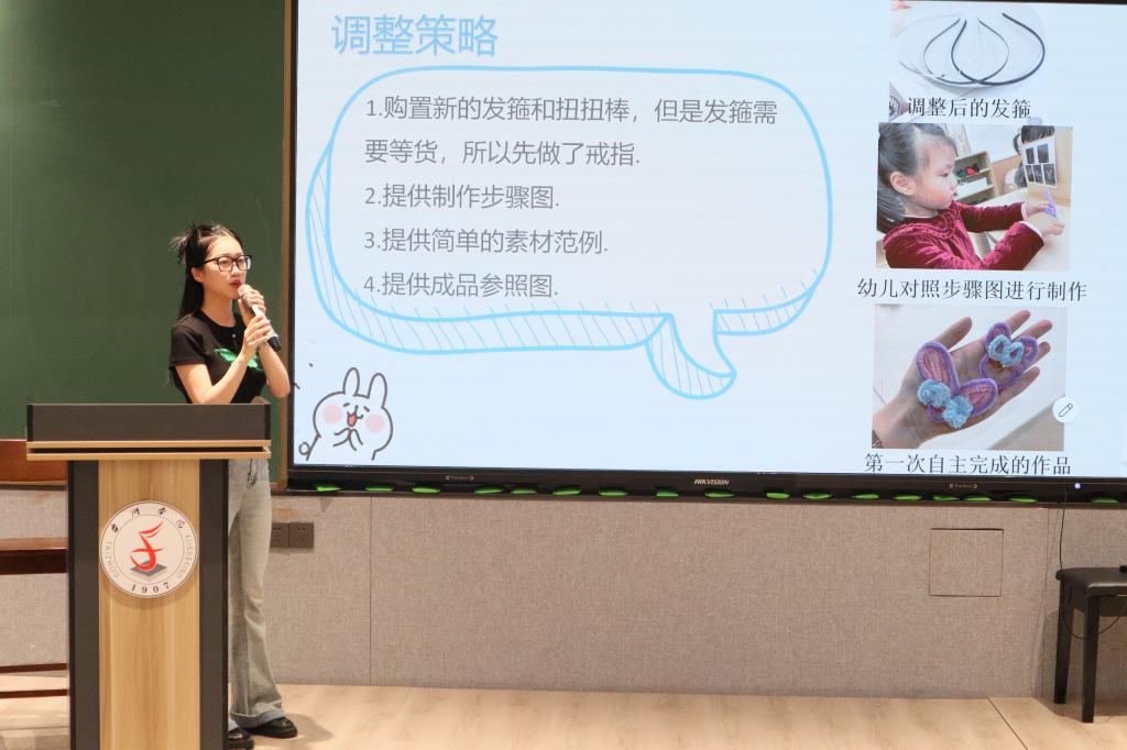 讲座伊始,2012级马如意学姐、2013级徐静怡学姐和杨诗意学姐分别就她们所负责的班本课程《我好开心》《石在有趣》《万物皆可扭扭棒》做了精彩分享。她们详细描述了引导幼儿通过观察、探究和学习,实现从无到有,从不会到能的过程,并最终实现了满足幼儿兴趣、培养幼儿个性的目标。同学们通过学姐们的分享,深刻体会到了学前教育的魅力和挑战。