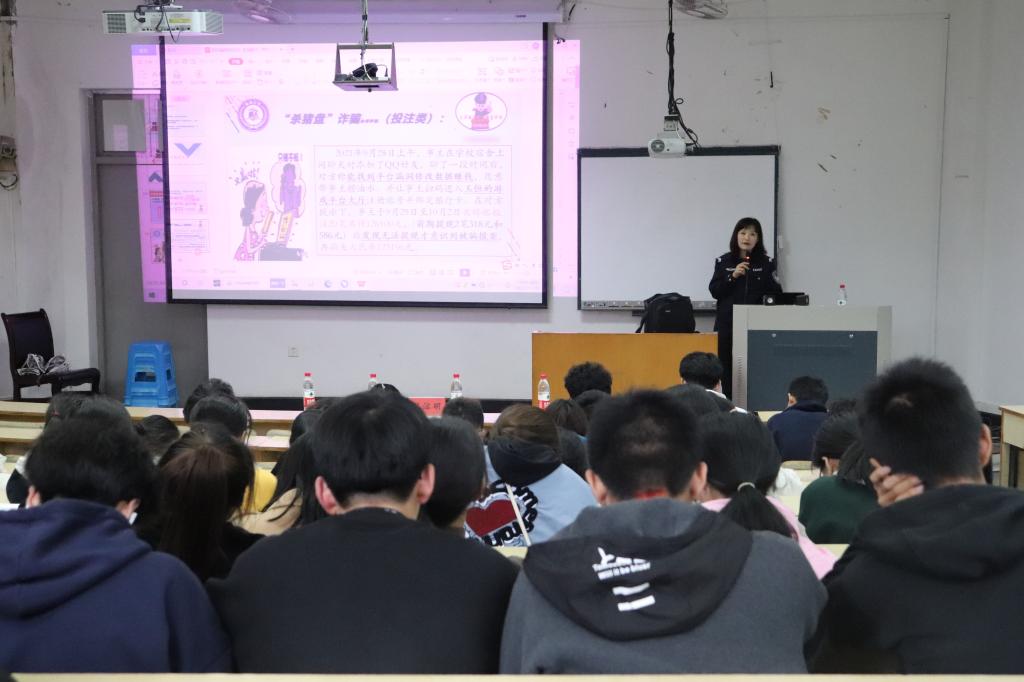 讲座伊始,徐扬益警官首先用数据呈现了2021年大洋派出所经手的诈骗案件,并让同学分享身边曾出现的诈骗案例。随后,徐警官从“游戏交易类”“购物退款、冒充客服类”“冒充身份类”“杀猪盘”“裸聊招嫖类”六种诈骗形式出发,介绍了一些真实案例和作案手法,并播放相关诈骗类型的视频。最后,徐警官给我们提供了预防诈骗的方法和遇到诈骗情况时的补救措施。