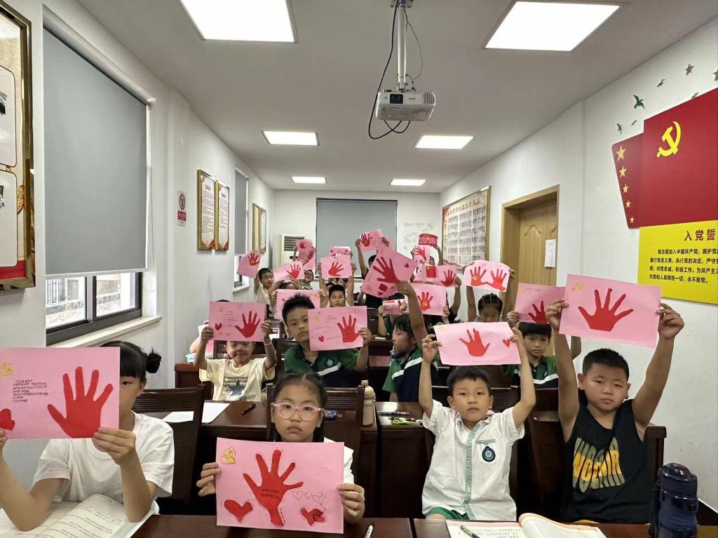 手工课则结合手工艺术教育与爱国主义教育。孩子们利用彩纸剪拼出手掌的形状,在手心里,拼贴爱心、党徽,在动手制作的过程中,感受党的庄严。