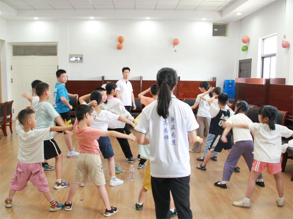 体育课堂融合武术教育与红色文化,围绕形神拳和五步拳,通过互动体验来锻炼身体,推动更多青少年接触并喜爱中国武术。同时,也让实践队员们提升教学技能,增强教育情怀。