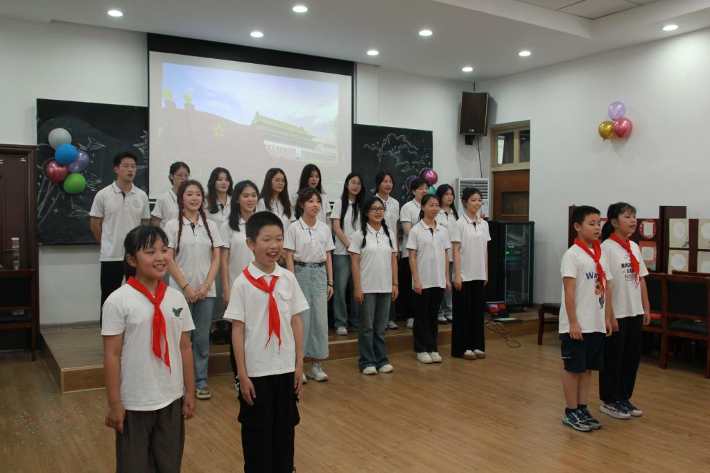 最后,实践队队员带领四名同学演唱《唱支山歌给党听》,朗诵《如果信仰有颜色》,旋律与诵读声交织成歌,不仅穿越了岁月的长河,更紧密地连接了师生的心。汇演结束后,家长和孩子们共同欣赏这十三天中创作的绘画、手工和书法作品,了解他们的成长与进步点滴。