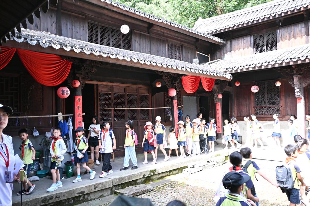 研学之旅的首站是灵溪村最为瞩目的古建筑——聚景楼。这座保存完好的四合院,布局精巧,曾是举人居所。宅院大门上的“素位安贞”四字,以及水门上镌刻的“入孝”、“出悌”,无不透露出古代士人的高尚品德与家族教育的严谨。两侧高墙上的“福”、“禄”二字,更是寄托了古人对美好生活的向往与追求。漫步其间,实践队队员与少先队员们仿佛穿越回那个古朴而纯净的时代,深切感受到廉洁文化在历史长河中的悠远回响。