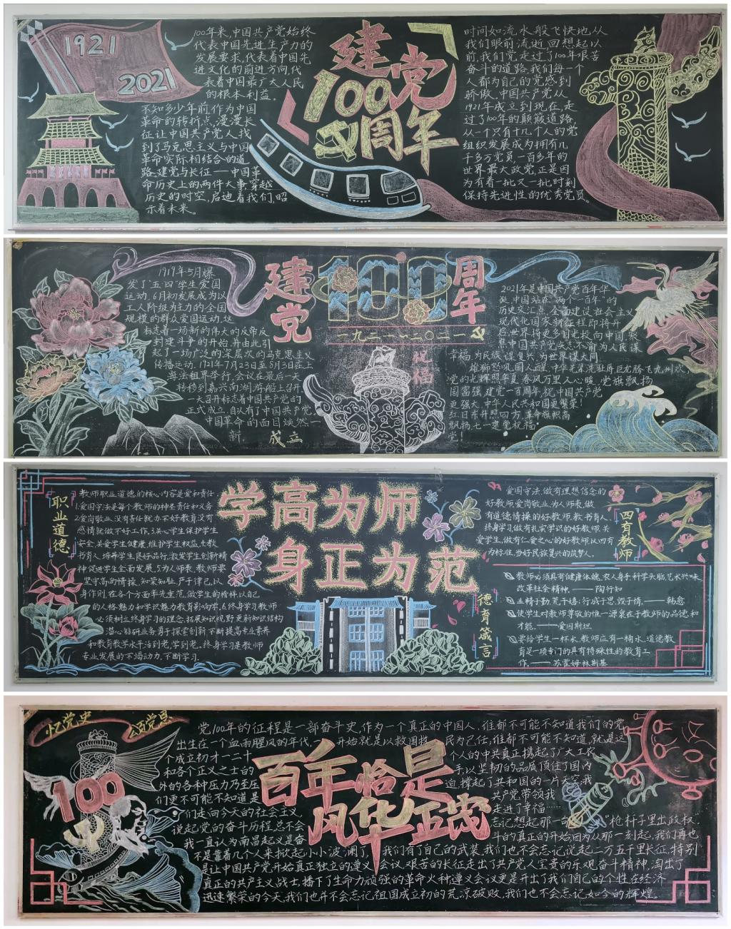本次黑板报大赛围绕“感动中国人物”“民法典时代”“全面小康”“师风师德”“专业认证”和“建党100周年”等主题进行绘写。参赛同学两两配合,细致地进行创作,其中多数同学选择了“建党100周年”这一主题,黑板报中那一颗颗闪烁着光芒的党徽,那一面面迎风招展的五星红旗,无一不昭示着莘莘学子敬党爱党的信念。最终各位评委老师通过线上投票,在这些作品中选出一等奖两名,二等奖四名及三等奖六名。