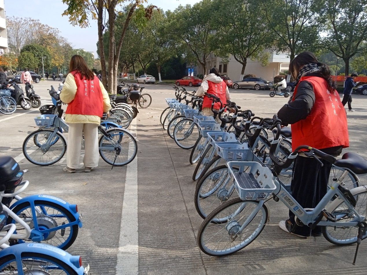活动中,党员和志愿者们开始对共享单车进行梳理,并把食堂边随意停放、倒放的单车主动扶起并有序摆放整齐,将占道、乱停乱放的共享单车推到指定停放点,同时员工党员和志愿者们还主动清理地面垃圾。为了提升同学们文明用车的意识,党员和志愿者们还向过往同学宣传文明骑行、有序停放的做法,引导骑行者将共享单车停放在相应的区域。