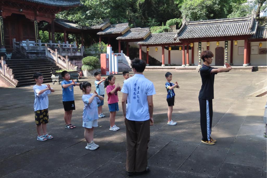 孩子们在缩山拳传习所观看有关缩山拳的纪录片,进一步了解缩山拳的历史起源、传承发展及当代价值,跟随缩山拳传习所的老师学习“缩山拳”。孩子们随着口令挥拳踢腿,在一招一式中感受拳法中的刚毅精神。他们有力的动作透着对英雄的崇敬。在止止堂石棋处,老师组织大家进行了一场有趣的投壶游戏,孩子们像古人一样投掷箭矢,在欢声笑语中体验古代的娱乐活动。