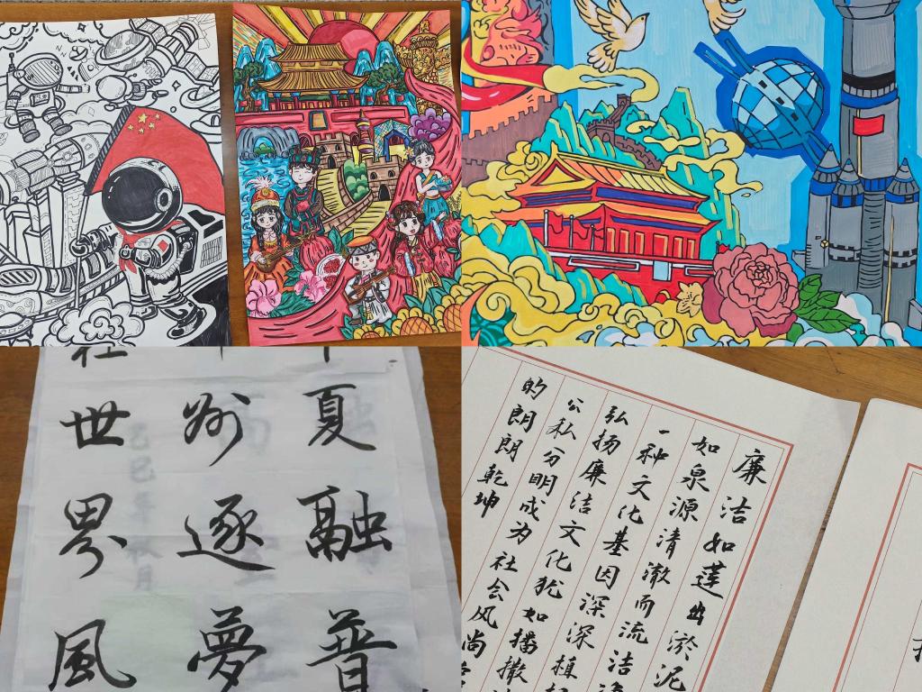大赛气氛热烈,同学们积极参与,参赛作品题材丰富,形式多样,充分展现对传统艺术的深刻理解与创新探索。书法作品涵盖楷书、草书等多种书体。楷书端庄大气,笔力遒劲;行草行云流水,抒情写意。隶书则在古朴中见新意,融传统笔法于现代审美,展现出独特的艺术感染力。硬笔书法作品亦笔迹工整、结构严谨,于方寸之间彰显汉字之美。绘画作品生动可爱,细腻精微,在传统题材中注入新的思考,展现了传统书画艺术在新时代下的旺盛生命力。
