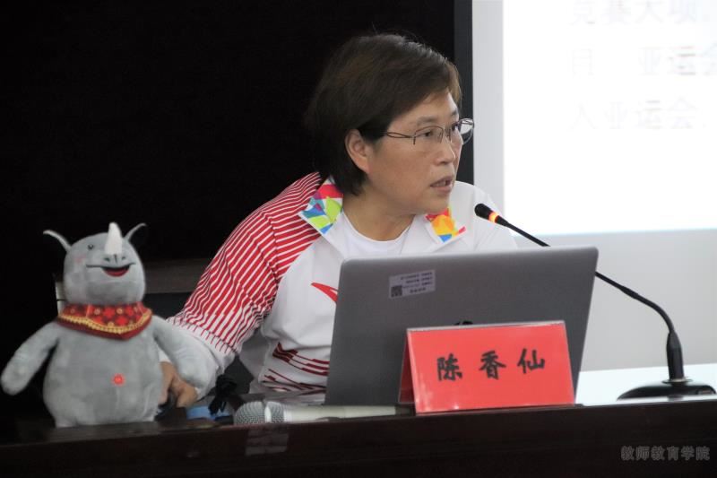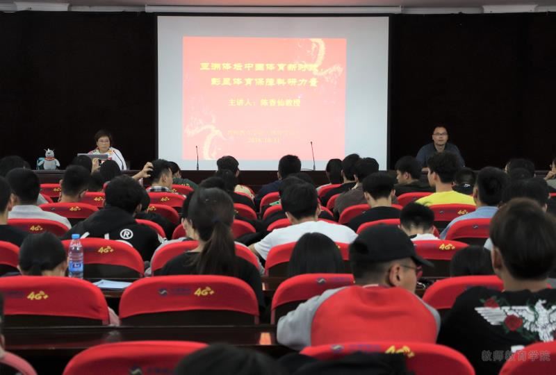 为弘扬中国体育精神,增加员工对科研保障体育的认识,10月11日下午,教师教育公司(体育公司)在临海校区学术报告厅举办以“亚洲体坛中国体育新时代,彰显体育保障科研力量”为主题的学术讲座。讲座由教育公司教授、理学博士、硕士研究生导师、高级保健按摩师陈香仙老师主讲,林辉杰副经理主持,公司教师和17级、18级体育教育专业全体员工及18级小教、学前专业各班代表参加。