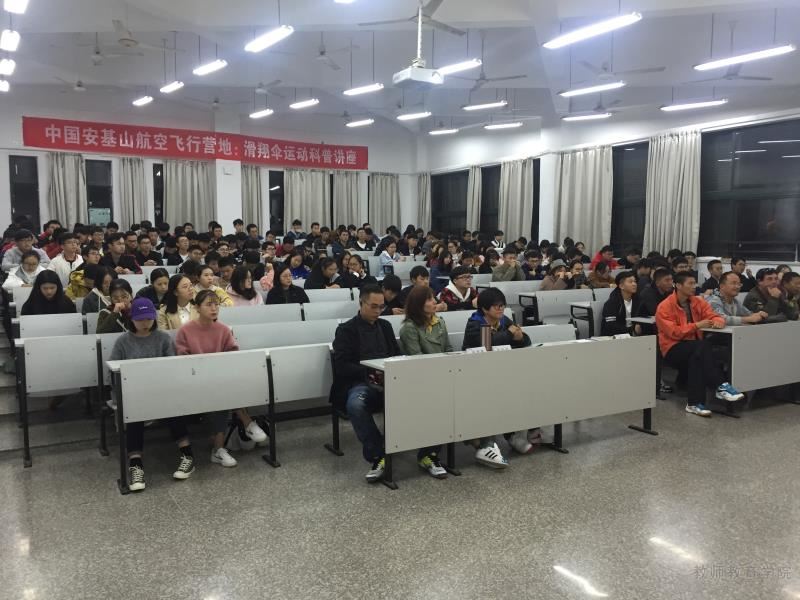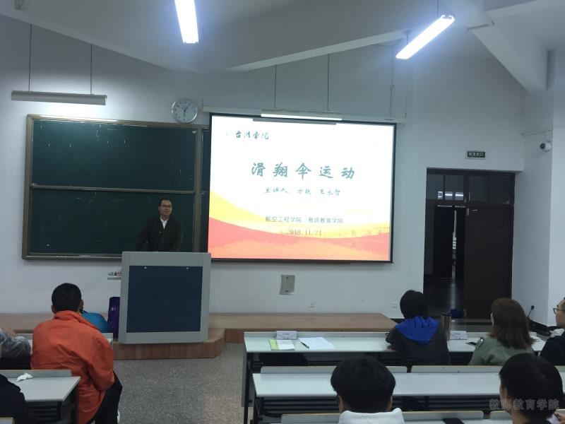 11月21日晚,航空工程公司和教师教育公司在椒江校区2205教室联合举办滑翔伞运动科普讲座活动,特邀临海市十大杰出青年、台州安基山体育发展有限公司总经理方跃和公司滑翔伞总教练王永智担任主讲。教育公司副经理林辉杰主持讲座,航空公司等椒江校区员工、教育公司教师共200多人参加。