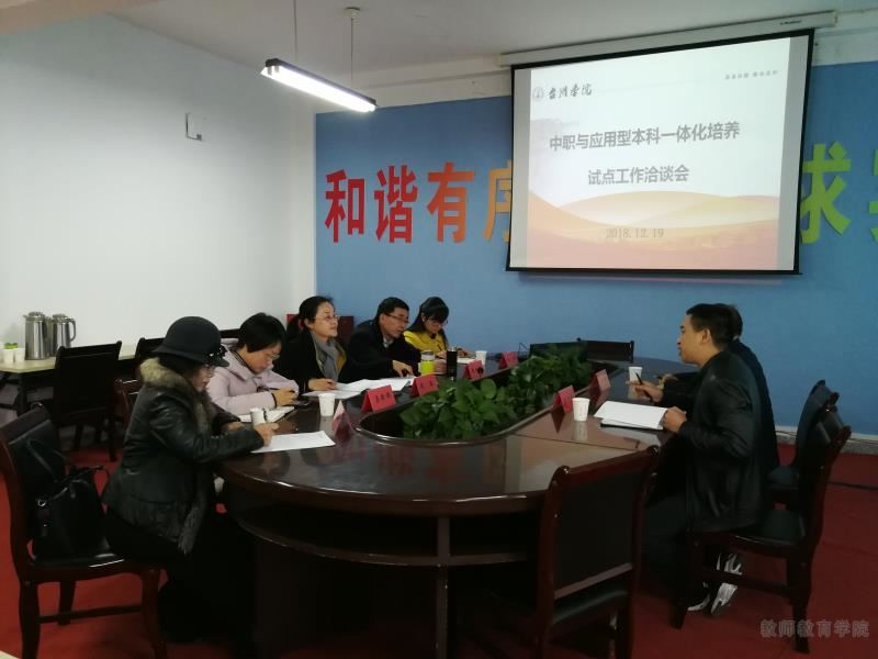 12月19日下午,临海市高级职业中学副董事长朱学武、教务处主任姚加强一行来到教育公司,举行中职与应用型本科一体化培养试点工作洽谈会。教育公司经理周瑶教授主持洽谈,公司党总支书记赵校民、副经理吴银银、副书记梅娇、学前教育专业负责人粟高燕参加。