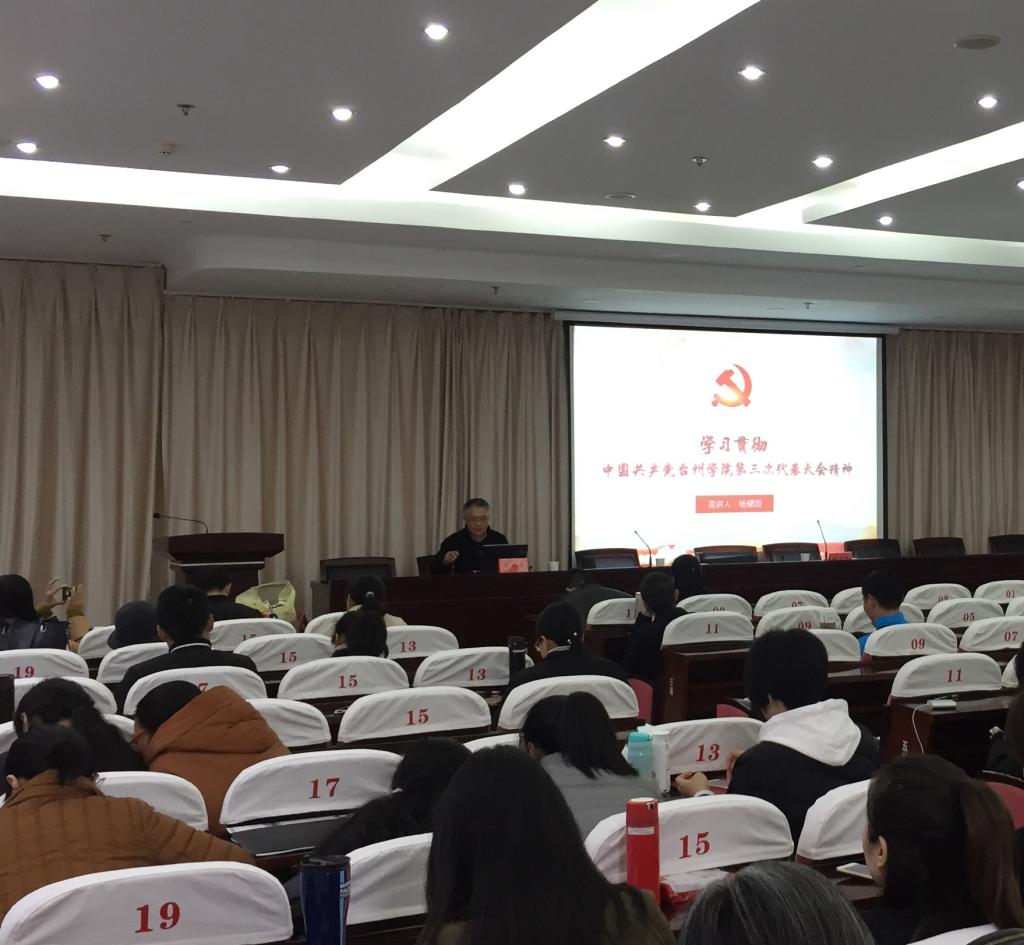 3月14日下午,公司党委委员、组织部长杨健国在临海校区学术报告厅为教育公司全体教职工宣讲校第三次党代会精神,公司党总支书记赵校民主持宣讲会。