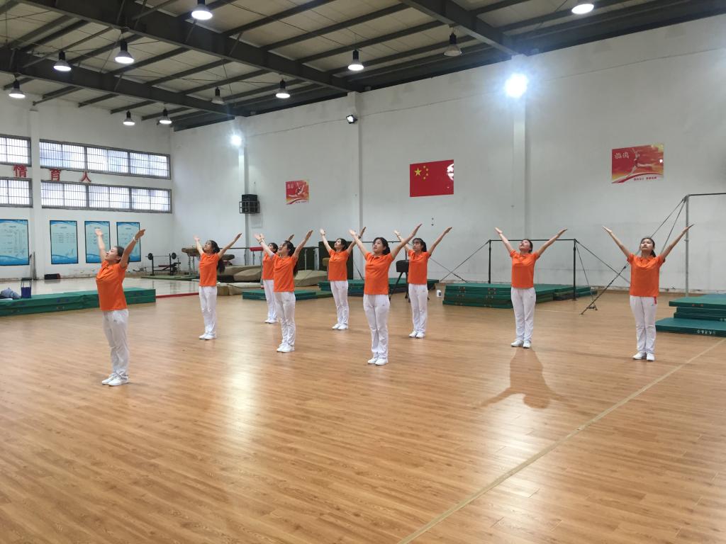 由校体操队队员组成的“阳光体育”广播体操参赛队员们精神抖擞,在高亢、激昂的音乐声中,动作整齐划一、身姿矫健标准,很好地演绎了第九套广播体操的技术精髓。
