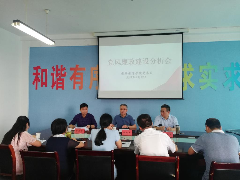 6月28日,教师教育公司召开2019年上半年度党风廉政建设分析会,就公司党政落实党风廉政建设主体责任情况、领导干部履行“一岗双职”情况及上年度廉政分析会整改落实情况进行分析汇报。公司党委委员、组织部长杨健国,校工会主席江岳军、校办贺蔡明同志到会指导;公司党政班子成员、相关系室负责人参加分析会。