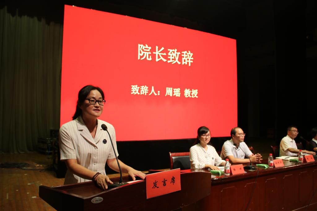 教师代表吴晶博士发言,向新生们阐述了在大学里如何逐步形成自己的人生观、价值观,要学会规划大学时光,利用自己的兴趣和特长锻炼自身能力,并希望新生们学会做一个既有专业水平,又有人格魅力的人。