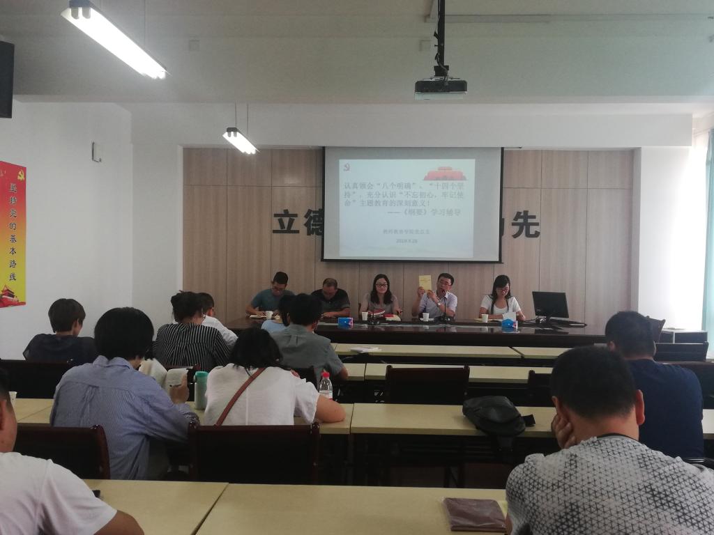 赵校民书记首先带领在座教师学习了《习近平新时代中国特色社会主义思想学习纲要》,从历史视角、中国传统文化、国家安全和世界格局演变角度领会了“八个明确”、“十四个坚持”的重要性,充分认识了中国梦的本质和主题教育的思想内涵。