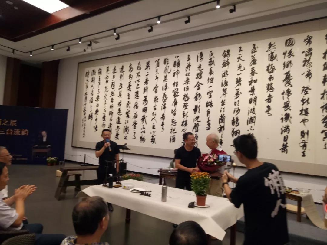 台州市书法家协会秘书长刘波亮老师代表台州市书法家协会向卢乐群先生献花。