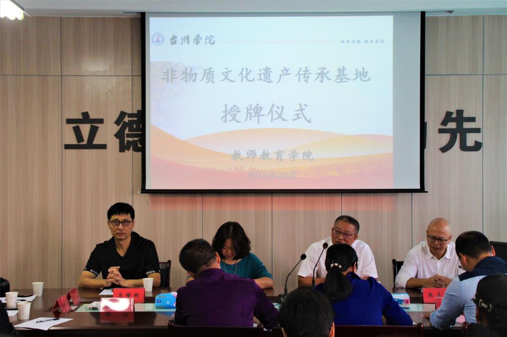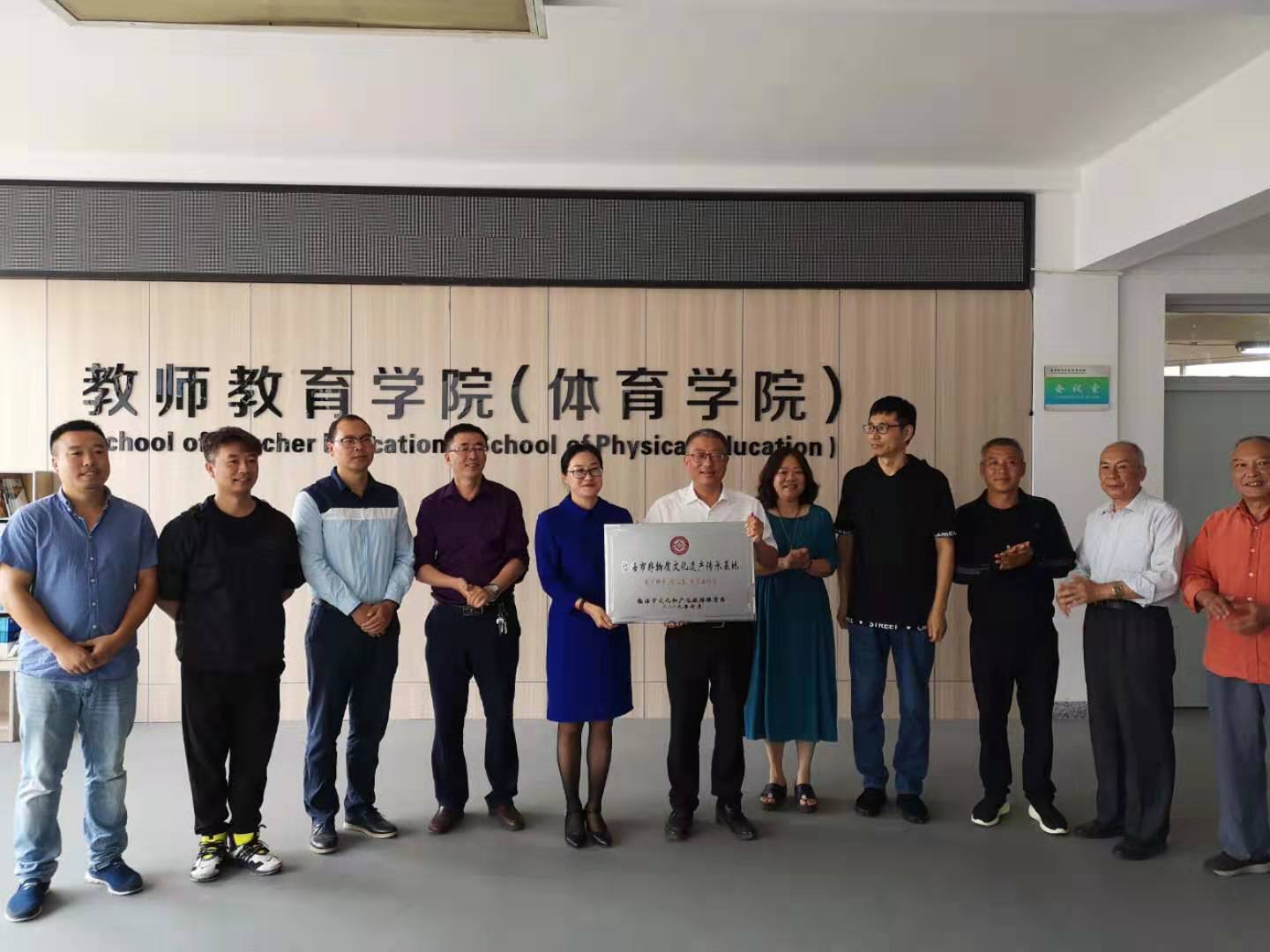 10月14日上午,临海市国家级非遗项目黄沙狮子、浙江省级非遗项目大石车灯戏、缩山拳传承基地授牌仪式在教师教育公司(体育公司)举行。临海市文广旅体局局长王荣杰,临海市文广旅体局副局长冯海燕,非遗中心主任张志军,非遗协会秘书长沈建中,黄沙狮子传习所主任、传承人王建,缩山拳传承人马曙明,大石车灯戏传承人金学文、金仁罡,教师教育公司经理周瑶,党总支书记赵校民,副经理林辉杰,覃宇德博士,樊坤老师参加了授牌仪式。