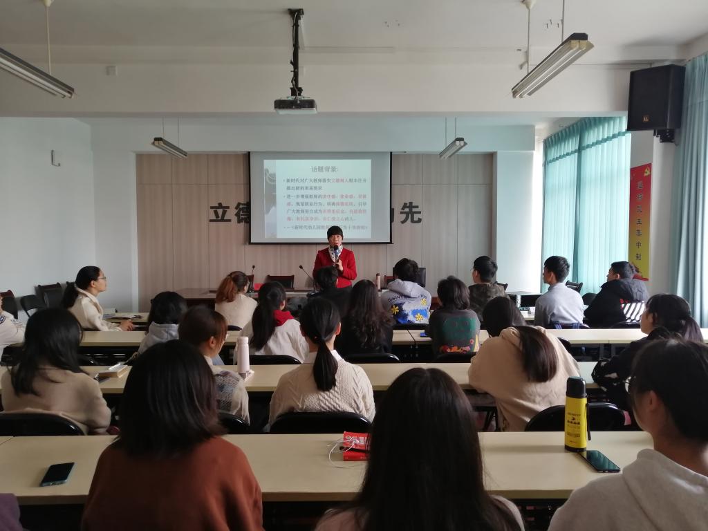 11月21日上午,华东师范大学周念丽教授应教师教育公司(体育公司)邀请,来校作“幼儿园教师的核心素养养成之思考”的学术讲座。学前教育系副主任汤霞敏主持讲座, 2018级学前教育专业员工参加。