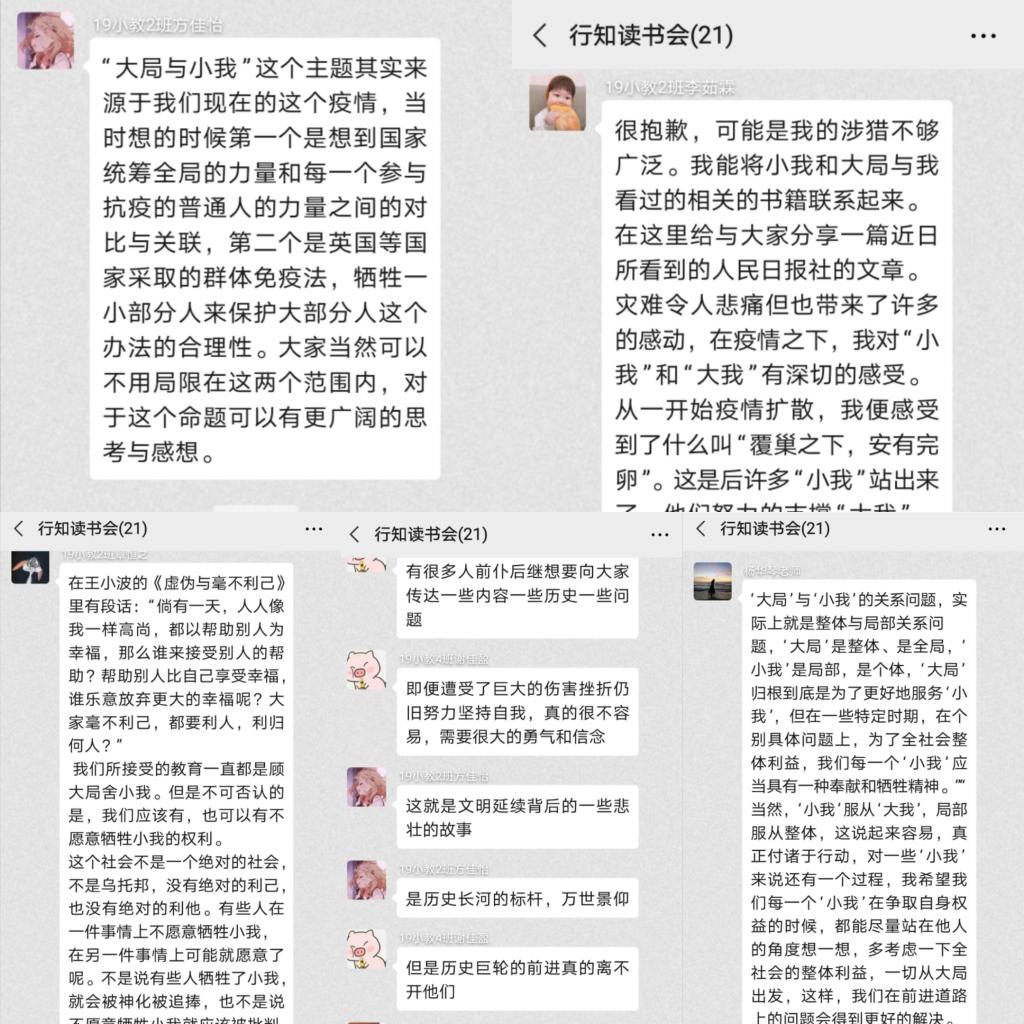 为丰富校园文化生活,提升老员工阅读兴趣,3月26日下午,教师教育公司(体育公司)通过微信软件举办了以“大局与小我”为主题的线上行知读书会。参与本次活动是辅导员杨华琴,及各班员工代表。