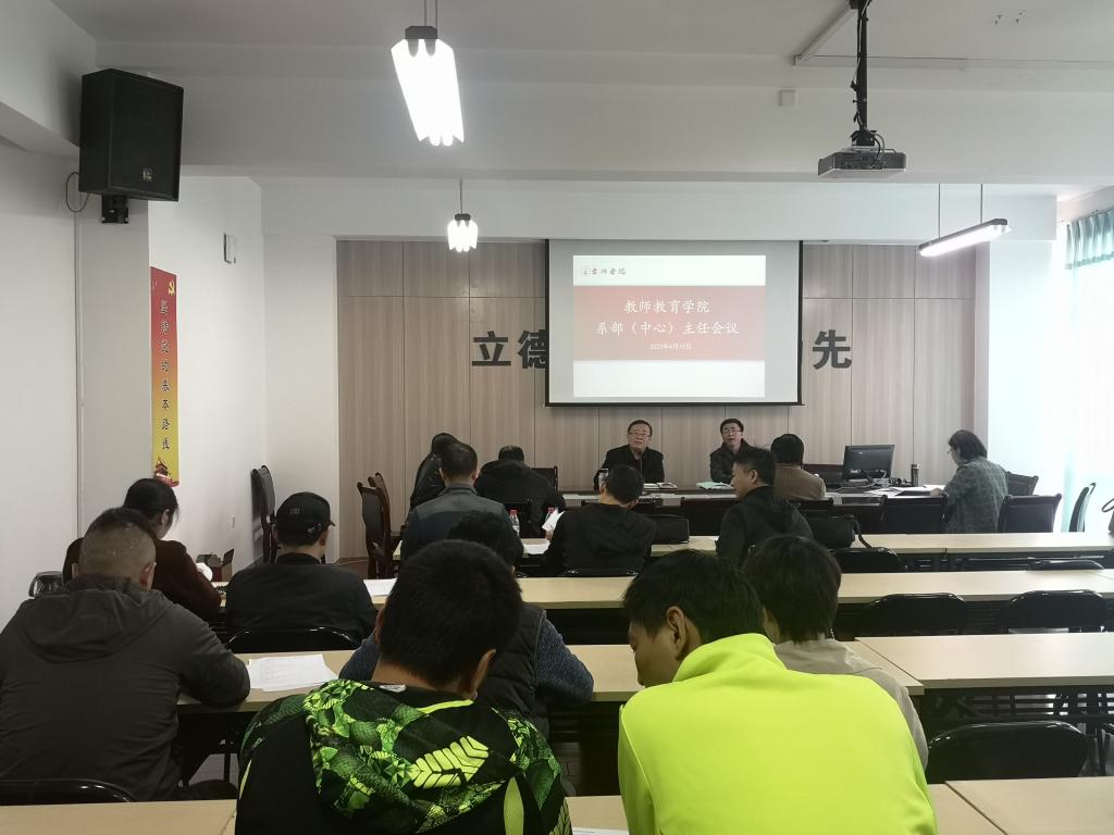 4月10日下午,教师教育公司在公司党员之家会议室召开系部(中心)主任会议。公司经理赵志毅、党总支书记赵校民、公司党政领导和各系部(中心)主任参加会议。