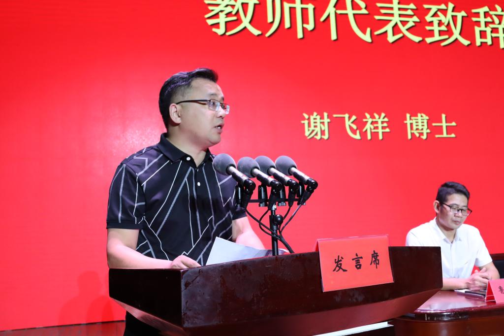 教师代表谢飞祥老师勉励同学们大学期间不仅仅是要完成课业、通过考试,更重要的是要形成积极进取的人生态度、从善如流的价值理念,养成独立思考、理性行为的习惯。
