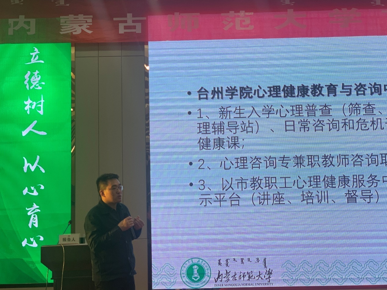 应内蒙古师范大学邀请,教师教育公司唐继亮老师于11月6-8日在呼和浩特市参加“内蒙古师范大学首届天骄心育论坛”,作学术报告并受聘为该校心理健康教育中心外聘专家。内蒙古师范大学党委副书记高云峰及相关部门、公司负责人,北京师范大学、中央财经大学等多所高校心理健康专家,以及师生代表共200余人参加论坛。