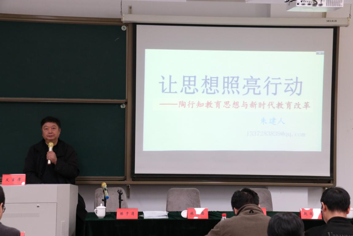 中国陶行知研究会副秘书长朱建人教授作《让思想照亮行动——陶行知思想与新时代教育改革》报告。朱教授充分联系生活实际,阐述了陶行知生活教育思想的核心,认为推进教育改革需要陶行知,生活教育理论指导素质教育的实施,教学做是一体的,以教人者教己,在劳力上劳心。我们需要以“创造教育”思想去改造死读书、读死书的应试教育,需要主动学习层面的讨论、实践与教授他人,发展员工的生活力,促进人的可持续发展。