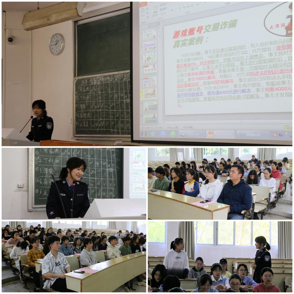 讲座伊始,徐扬益警官首先用数据展现了2020年大洋派出所经手的诈骗案件,并指出了诈骗案件层出不穷的现状。接着,徐警官向我们解释了“通讯网络诈骗”的性质和类型,并从“网络客服诈骗”“电信诈骗”“兼职刷单诈骗”等角度入手,列举了我们身边的各种真实案例,分析诈骗团伙的作案手法,从而警示同学们要提防网络中可能存在的诈骗行为。随后,徐警官播放了多种诈骗类型的相关视频,使同学们能更加直观地了解诈骗团伙的作案手法。最后,警官向我们分享了预防诈骗的方法和发现自己被诈骗后的应急措施。