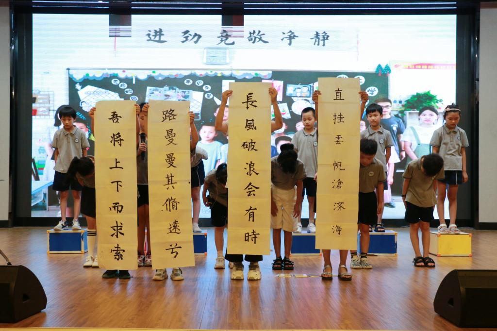 接下来,由朗诵班的孩子们带大家畅想《假如风是有颜色的》,四季的风,五彩的风,将这世界吹得风光秀丽、万紫千红,同时也摇曳着我们心中多彩的中国梦。所有人一起沉醉在孩子们的朗诵之中,在他们的表达里领略风的魅力。而书法班的孩子们将歌曲《孤勇者》与毛笔书法相结合,在演唱的同时进行书法创作。他们用这种独特的方式来表现坚持不懈、英勇无畏的理想信念,也赞扬了那些在生活中无畏奉献的孤勇者们。