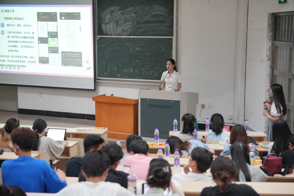 在考研经验分享环节,十名考研上岸的优秀代表依次进行发言,从科目、择校、习题、心态等不同方面向学弟学妹们全面传授了考研相关的经验,加深了同学们对考研的了解和认识。在最后,学长学姐们结合自身经验,对同学们的问题进行一一解答。