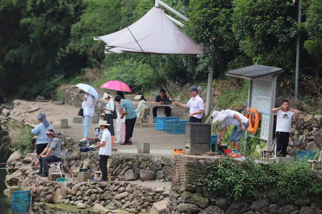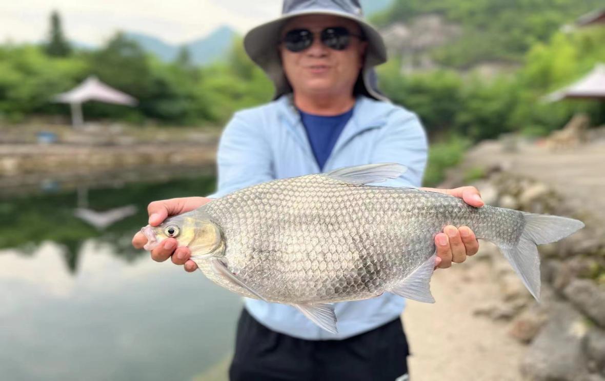 天公作美,虽是六月天,但烈日并未直射大地,而是被层层云彩遮掩其后,天气凉爽怡人。再加上双庙风景秀丽,触目皆景。崇山翠谷之中,一汪清湖如明镜映入眼帘,条条鳍鳞游曳其中。徜徉于这般美景之中垂钓,别有一番风味。