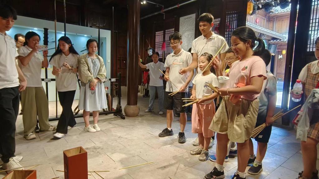 在紫阳拳社,琳琅满目的各式兵器陈列在展柜中。这些兵器不仅代表着古老而辉煌的历史,更是浙拳文化的重要组成部分。在拳社的大厅里,小学员们还一起参与了一场传统的投壶游戏。这是一个充满乐趣和挑战的游戏,要求参与者运用精确的技巧将壶投入目标区域。投壶游戏不仅锻炼注意力和协调能力,更有利于加深团队协作意识。