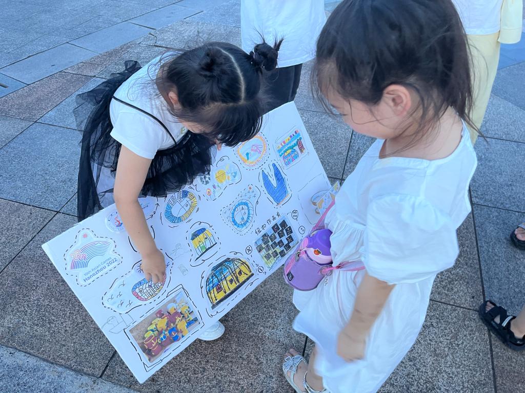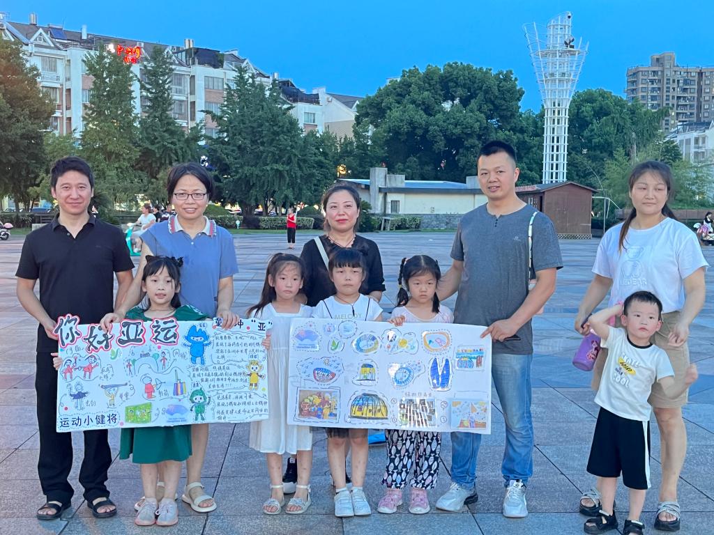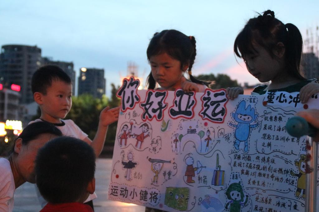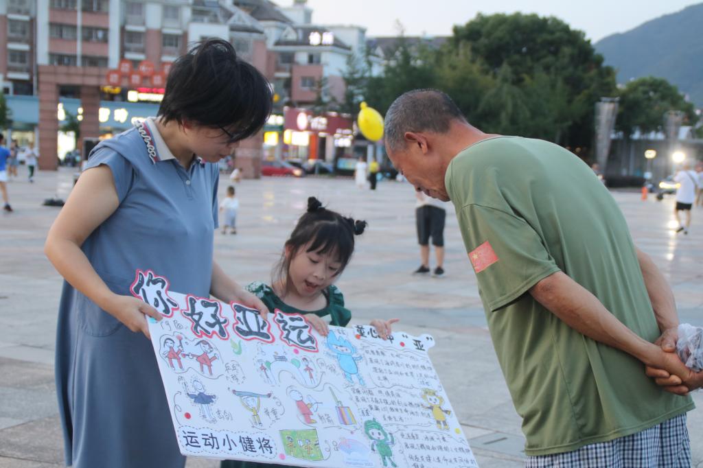暑期社会实践团成员和孩子们向大家展示了实践期间孩子们手绘的亚运场馆,帮助大家了解亚运场馆与项目。活动中孩子们积极互动,向天台县人民传递了亚运的别样精彩。