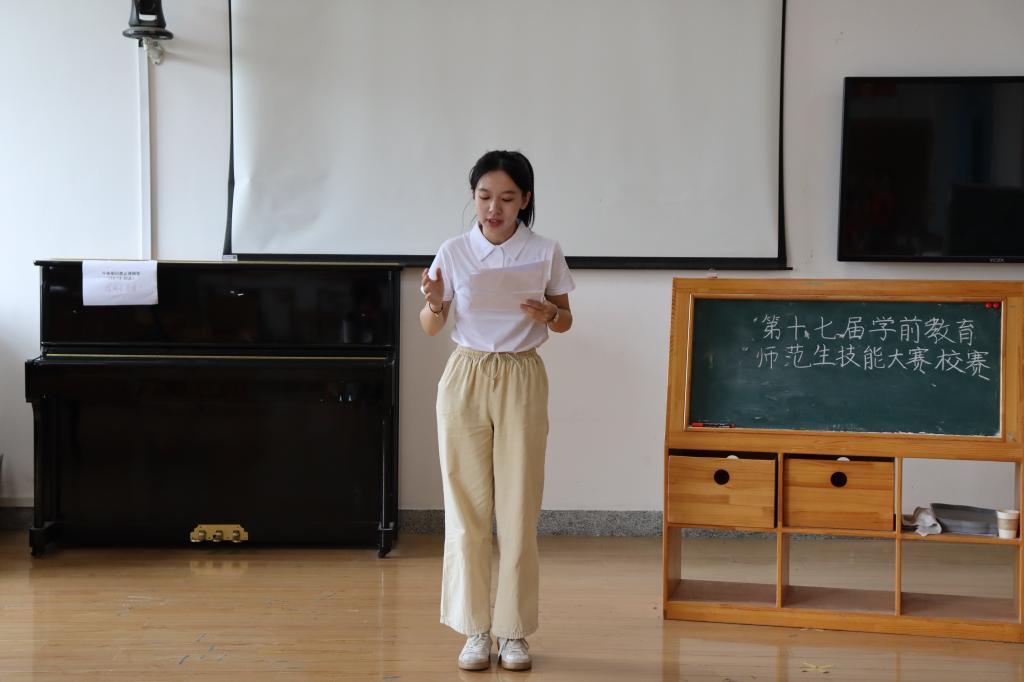 为锻炼学前教育师范生的专业技能与实践应用能力,9月14日下午,XCSport于8308教室举办了第十七届学前教育师范生技能大赛,此次比赛由学前教育系副主任汤霞敏、沈吟和专任教师王伟群、张冉老师担任评委。