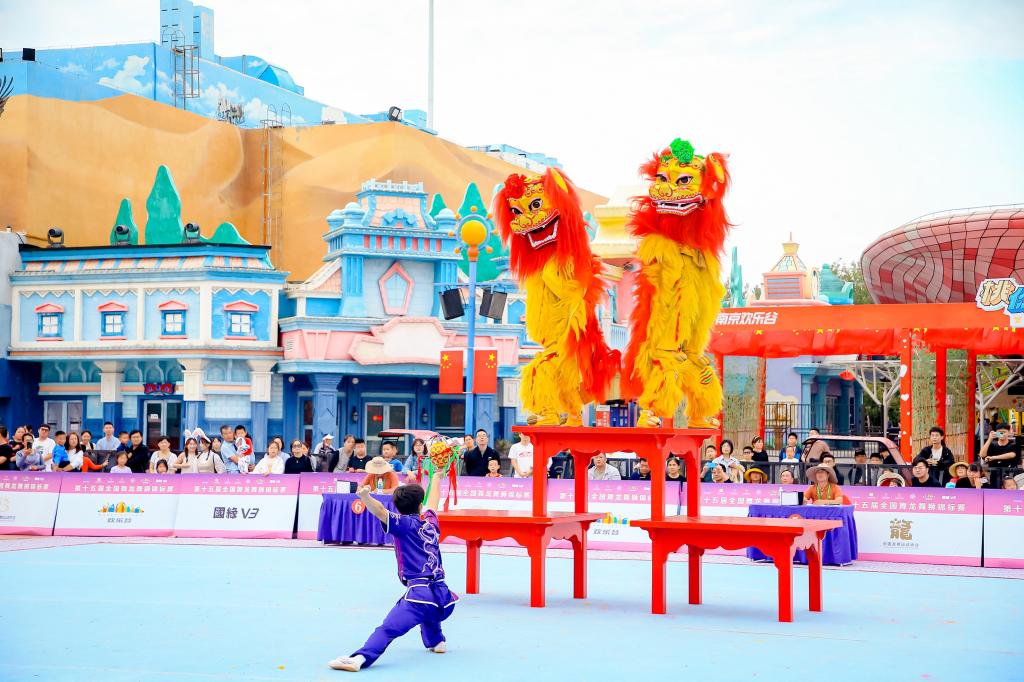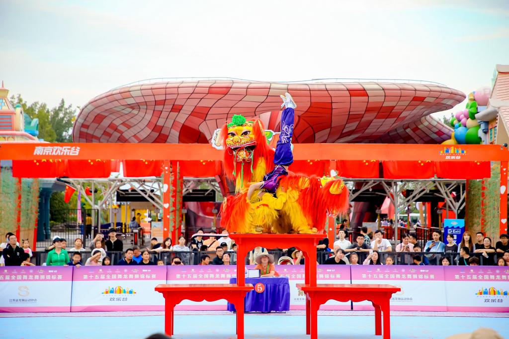 10月3日至6日,第十五届全国舞龙舞狮锦标赛(舞狮项目)在南京欢乐谷举行,来自全国17个省(市/区)的42支代表队、近500名运动员参赛。