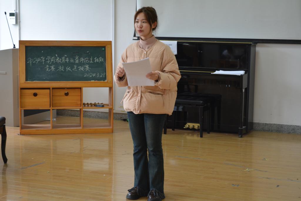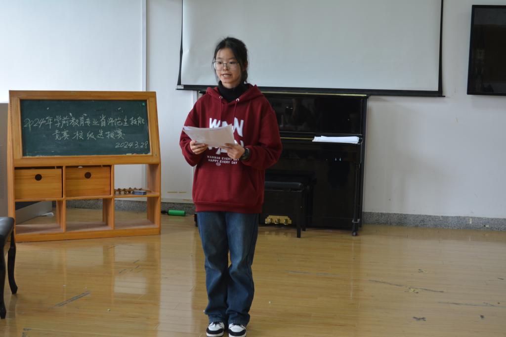 为进一步培养师范生教师职业信念,提升学前教育师范生的专业素质与综合实践应用能力,3月28日下午,XCSport于8308教室举办了2024年学前教育师范生技能大赛省赛预选赛。学前教育系副主任汤霞敏、沈吟和专任教师王伟群、张冉老师担任此次比赛的评委。