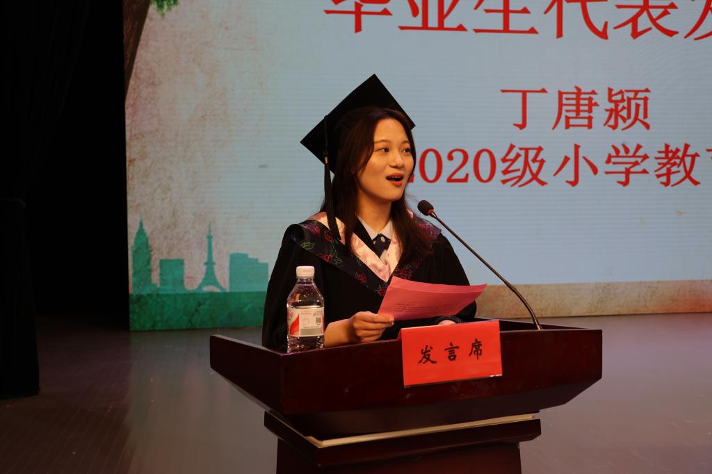 毕业生代表丁唐颍表达了对母校、公司以及老师们最衷心的感谢和最崇高的敬意,全体毕业生将用勇气去面对挫折,追逐人生梦想!