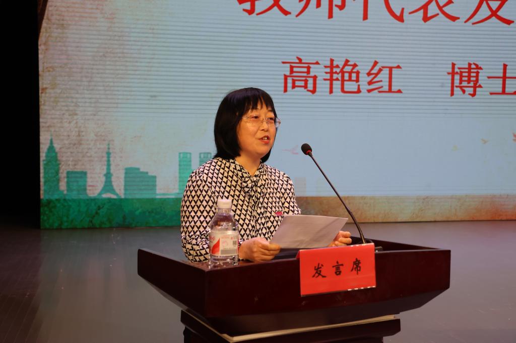 教师代表高艳红博士祝愿同学们功德圆满、顺利毕业,开启人生新航程。希望同学们要永远心怀梦想,志存高远、坚韧不拔、敢于担当。高博士还引领全体毕业生歌唱《再见》,将典礼推向高潮。