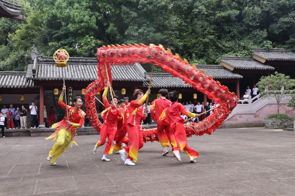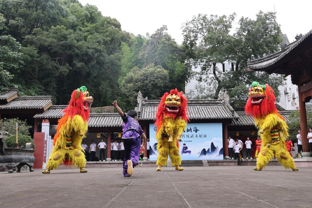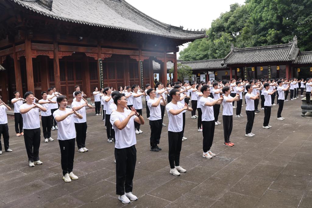 来自XCSport21级体育教育专业全体员工以及校舞龙舞狮队、校武术队队员,身着传统武术服饰,精神抖擞地列队站立,在樊坤老师的带领下,行抱拳礼,读《武德训》,习缩山拳法。缩山拳是浙江省省级非物质文化遗产,浙江地区最古老的拳种之一,戚继光的戚家拳和陈式太极拳都深受其影响,缩山拳节奏明快,一招一式,刚强有力,虚实分明,展演者的一招一式无不尽显中华之仪、强武之魂,为现场观众带来一场视觉与精神的双重盛宴,赢得了阵阵掌声。紧接着,技艺精湛的XC体育龙狮队伍跃入场内,伴随着锣鼓声,龙狮舞动生风,栩栩如生,将现场气氛推向高潮。