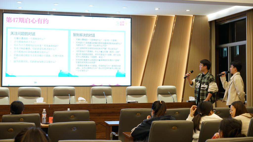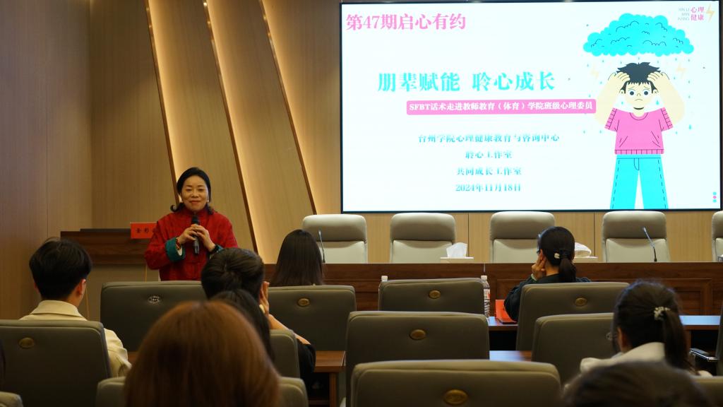 11月18日晚,“朋辈赋能,聆心成长——SFBT话术走进教师教育(体育)心理委员”主题讲座于临海校区5302会议室成功举行,此次讲座由校心理健康教育与咨询中心主办,XCSport聆心工作室、共同成长工作室协办。讲座邀请了校专职心理咨询师金彩云老师主讲,辅导员徐薇、朱佳婧出席,公司部分心理委员参与。