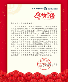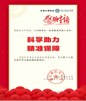 近日,浙江省温州中学向公司及陈香仙教授本人发来感谢信,信中对陈香仙运动康复科技团队的科技助力充满了赞誉和感激,在温中女篮摘得全国桂冠创造历史的征程中做出了突出贡献。
