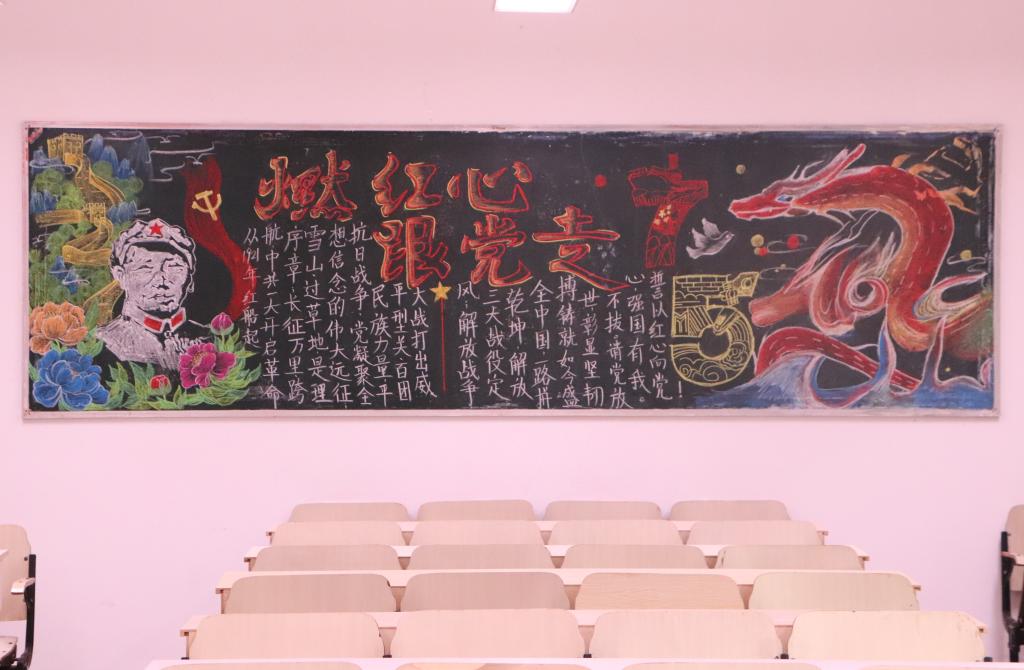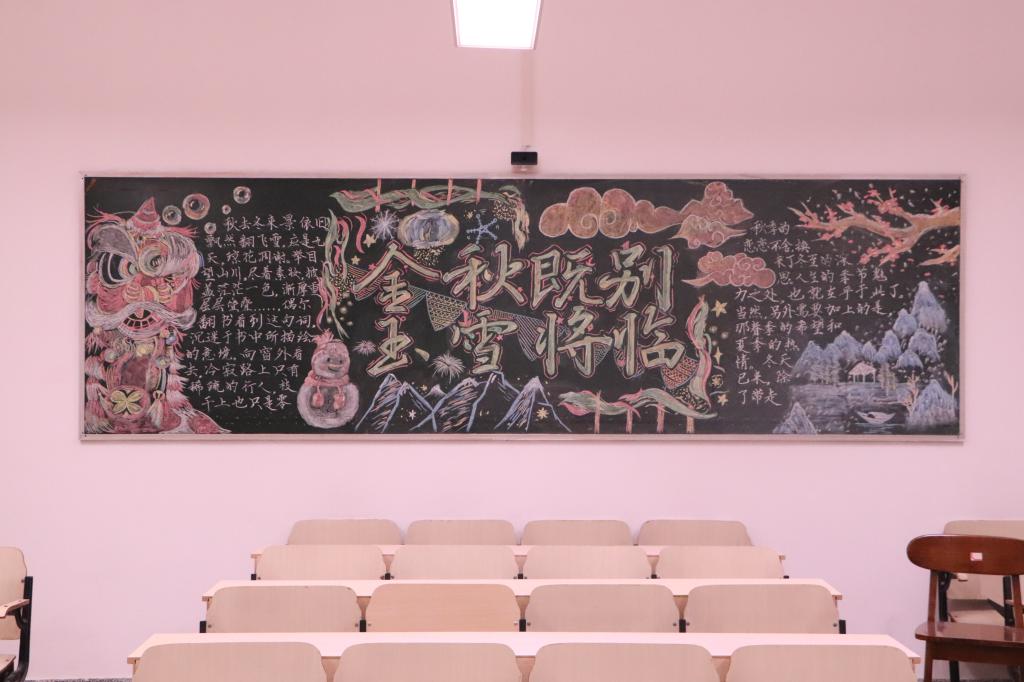 比赛中,各参赛员工小组热情投入,紧扣主题精心创作。有的小组以“金秋既别,雪将临”为主题,黑板上栩栩如生的雪花、憨态可掬的雪人,搭配着充满诗意的文字,仿佛将冬日的美景提前带到了校园。还有小组围绕“红心向党”展开设计,党徽闪耀在黑板中央,长城巍峨,文字激昂,传递出对党的无限忠诚与热爱。