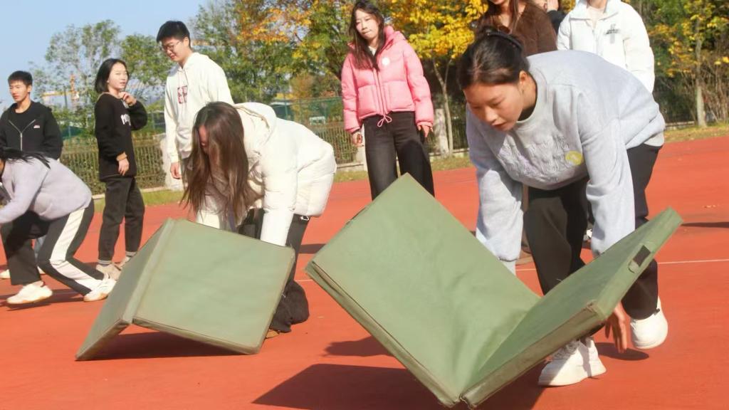 垫子接力赛环节,选手们身姿矫健,步伐匆匆,每一次交接都精准无误,每一个转身都敏捷利落。赛道旁的队友们热情高涨,呐喊声、助威声交织一片,为这场激烈的赛事增添了无限活力。