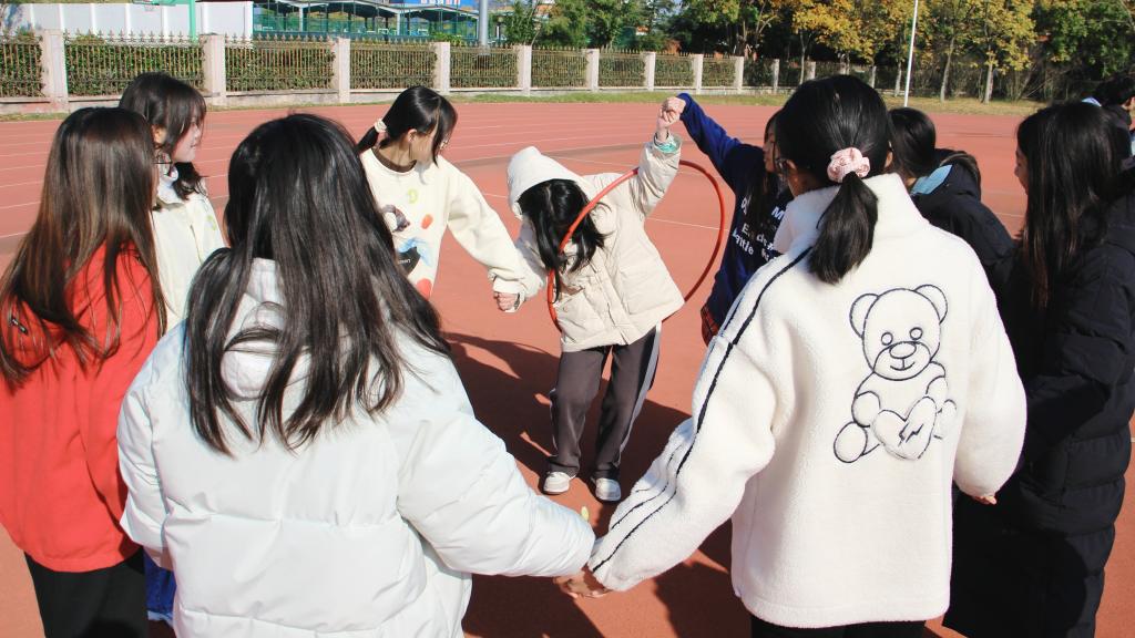 “一圈到底”环节,各队队员手牵手围成圈,让呼啦圈在身体间快速传递。大家动作或娴熟流畅,或稍显生疏,但都齐心协力调整节奏,欢声笑语在操场回荡。