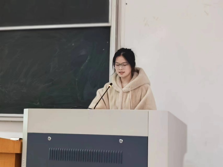 实习生代表沈姿妊同学上台发言。她表示要抓牢学习和锻炼的机会,提升自我的教学技能、培养班主任管理能力、落实教育研究工作,并号召同学们在日后的实习工作中内化师风师德,将理论运用于实践,为将来的就业打下坚实基础。